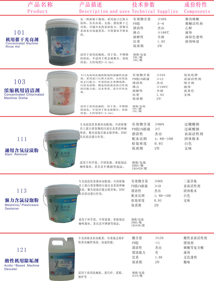 | WE101 機用催干光亮劑 | WE103 濃縮機用洗滌劑 | WE121 酸性機用除垢劑 |
